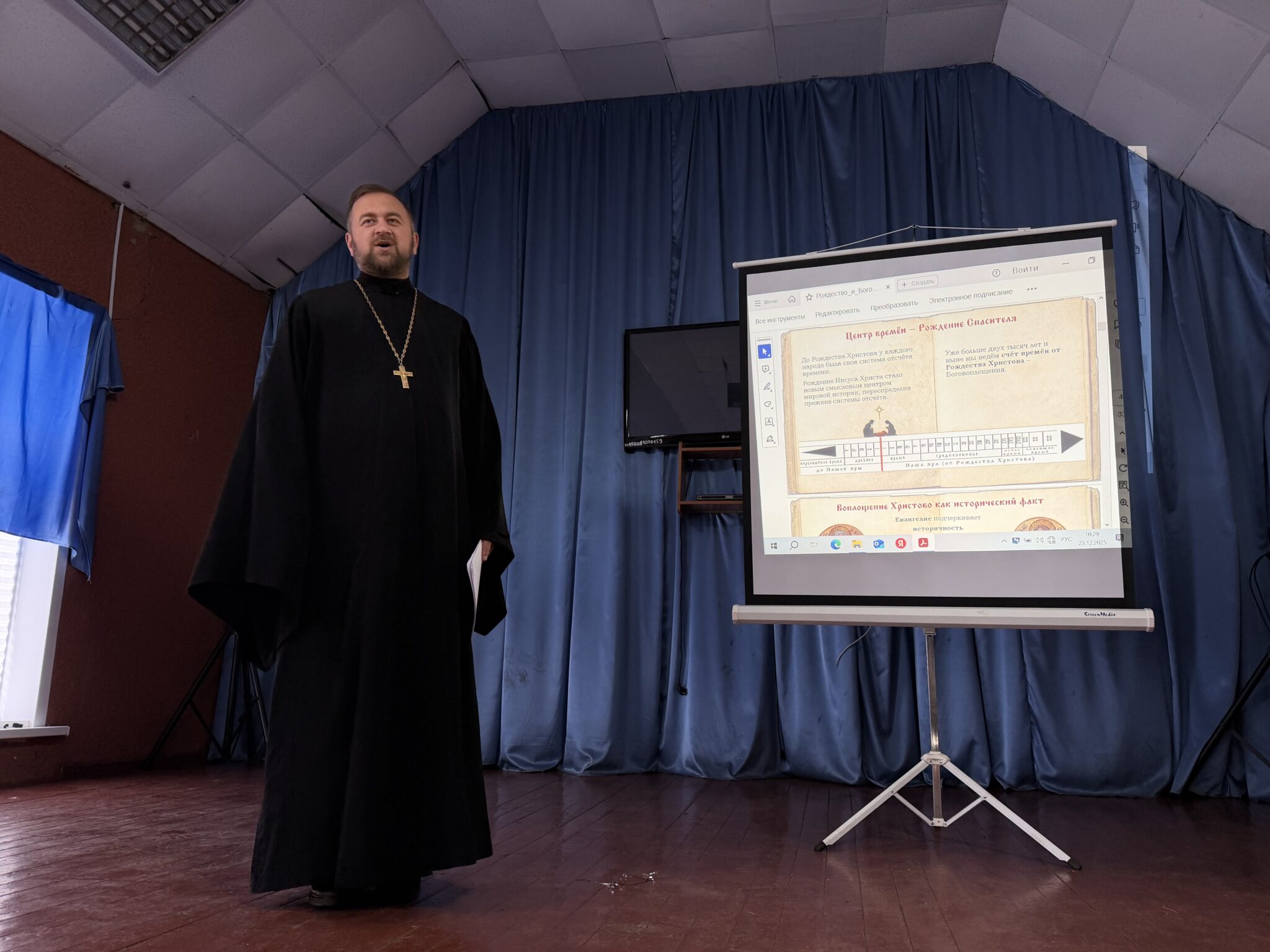 Благочинный Должанского района о. Дмитрий Глазков посетил участников лагеря и представил презентация синодального миссионерского отдела Русской Православной Церкви на тему «Рождество и Богоявление. От Вифлеема до Иордана. Свет изменивший мир». На встрече присутствовали участники смены, а так же педагогический состав лагеря. Батюшка презентовал яркие слайды с комментариями к ним. Дети были увлечены рассказом и задавали вопросы по теме презентации. Отец Дмитрий поздравил всех с наступающими праздниками Новым годом, Рождеством Христовым и Крещением Господа нашего Иисуса Христа!